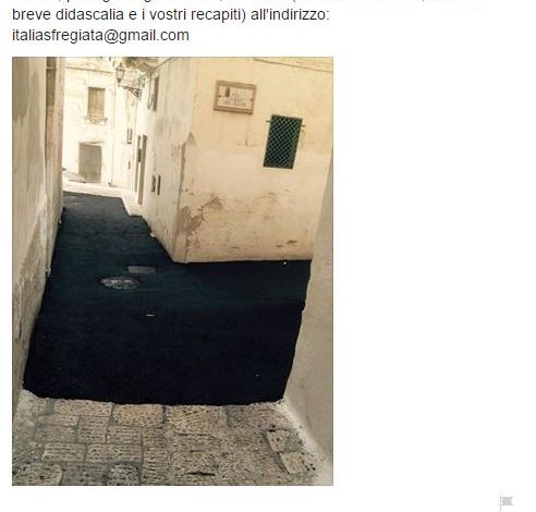 Il critico televisivo usa proprio una foto che ritrae un vicolo della Borgo Antico della città delle ceramiche ( chianche ricoperte di asfalto) per denunciare e far partire una campagna contro gli “obbrobri architettonici”:  L’Italia è piena di obbrobri architettonici e sfregi al Paesaggio. Molti in corso d’opera. Aiutateci a denunciarli. Inviate, per ogni segnalazione, n° 2 foto (ad alta risoluzione, con una breve didascalia e i vostri recapiti) all’indirizzo: italiasfregiata@gmail.com