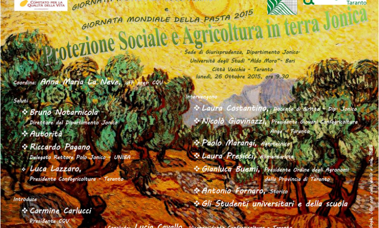 Si parlerà quindi di alimentazione in genere e dell’alimento principe delle tavole italiane, con un approfondimento legato allo slogan lanciato dalla Fao per questa edizione: “Protezione Sociale e agricoltura per spezzare il ciclo della povertà rurale”. Il focus degli interventi sarà poi incentrato sull’esperienza locale, “Protezione sociale e agricoltura di Terra Jonica”, su cui si confronteranno addetti ed esperti.