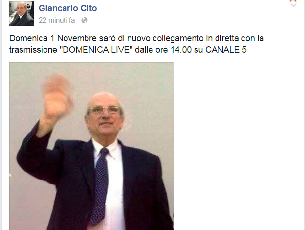 Lo apprendiamo in questi minuti dalla sua pagina Facebook. L’onorevole Giancarlo Cito, domenica 1 novembre, a partire dalle ore 14.00, sarà nuovamente in collegamento nel format domenicale condotto da Barbara D’Urso su Canale 5, “Domenica Live”. Di cosa si discuterà questa volta in diretta? Ricordiamo la scorsa domenica l’accesa discussione in merito al vitalizio, con il giornalista Diaco e Giorgia Meloni.