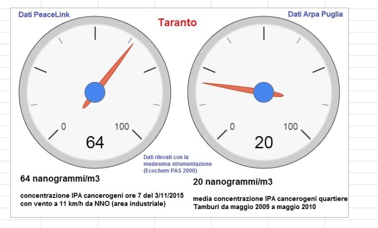 media 2009-2010 nelle 100 misurazioni che PeaceLink ha effettuato. I dati PeaceLink e dati ARPA raffrontati nell’immagine sono rilevati con la medesima strumentazione (Ecochem PAS 2000).ILVA continua a inquinare. Ed è grave che per l’assenza di alcuni europarlamentari l’ispezione all’ILVA sia saltata.