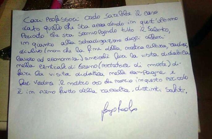 E ancora, c’è chi per sensibilizzare le famiglie, prende carta e penne e indirizza dieci righe ai professori dei vari Istituti coinvolti, denunciando l’inadeguatezza di condurre “una visita didattica nella centrale di Cerano (portatrice di morte)”.