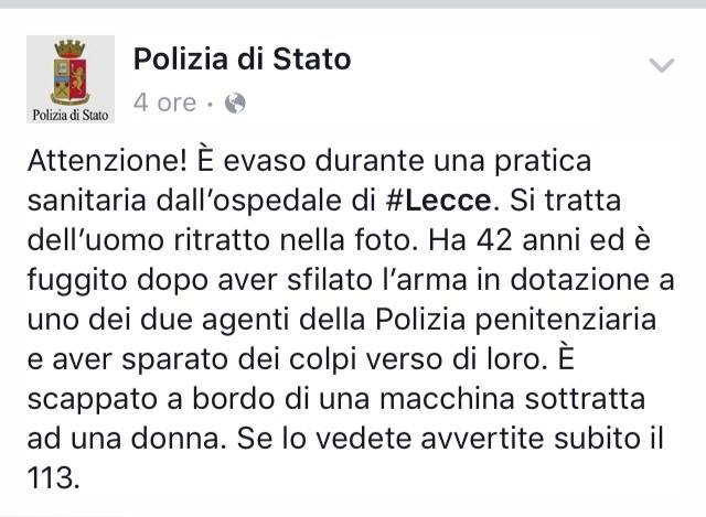 Non si sono mai fermate le ricerche di Fabio Perrone, il 42enne detenuto evaso ieri mattina, mentre si trovava all’ospedale “Fazzi” di Lecce, per un controllo medico. L’uomo ha sottratto la pistola ad uno degli agenti di Polizia Penitenziaria, sparando alcuni colpi e fuggendo via a bordo di un’auto sottratta ad una donna. Le ricerche proseguono in tutta la Puglia e anche a Taranto e provincia con numerosi posti di blocco. La Polizia di Stato ha diffuso la foto che ritrae l’uomo e un appello sulla propria pagina facebook. L’invito è quello di chiamare il 113, qualora l’uomo dovesse essere avvistato. Vi riportiamo qui il messaggio: