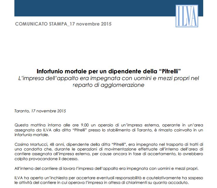 Questa mattina intorno alle ore 9.00 un operaio di un’impresa esterna, operante in un’area assegnata da ILVA alla ditta “Pitrelli” presso lo stabilimento di Taranto, è rimasto coinvolto in un infortunio mortale. Cosimo Martucci, 48 anni, dipendente della ditta “Pitrelli”, era impegnato nel trasporto di tratti di una condotta che, durante le operazioni di movimentazione effettuate all’interno dell’area di cantiere assegnata all’impresa esterna, per cause ancora in fase di accertamento, lo avrebbero colpito provocandone il decesso. All’interno del cantiere di lavoro l’impresa dell’appalto era impegnata con uomini e mezzi propri. ILVA ha aperto un’inchiesta per accertare eventuali responsabilità e cautelativamente ha sospeso le attività del cantiere in cui operava l’impresa in attesa di chiarimenti su quanto accaduto
