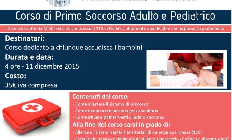 ECIPA Brindisi organizza un Corso di Primo Soccorso Adulto e Pediatrico. Il corso si terrà nella giornata di venerdì 11 dicembre 2015 dalle ore 15.30 alle ore 19.30 presso la sede formativa di Ecipa in Viale Belgio 30 (Quartiere Bozzano), a Brindisi. Il prezzo del corso è di 35 euro IVA compresa.