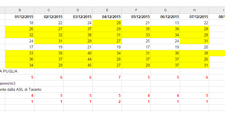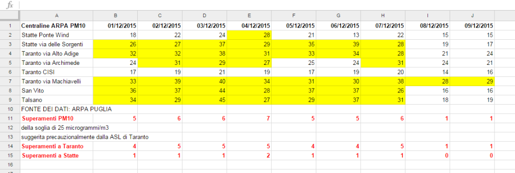 Questa è la situazione che PeaceLink sta monitorando usando gli stessi dati ARPA, a conferma che ufficialmente vi sono continui superamenti del livello precauzionale di 25 microgrammi a metro cubo fissato per il PM10 (le polveri sottili) dalla ASL di Taranto (in giallo evidenziatore trovate tutti i superamenti).
