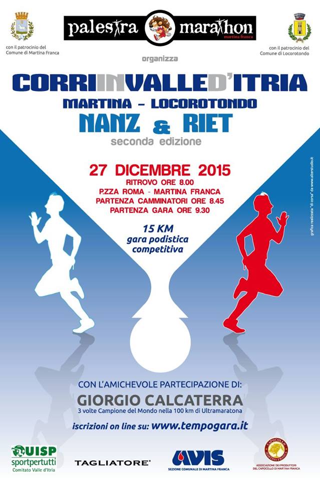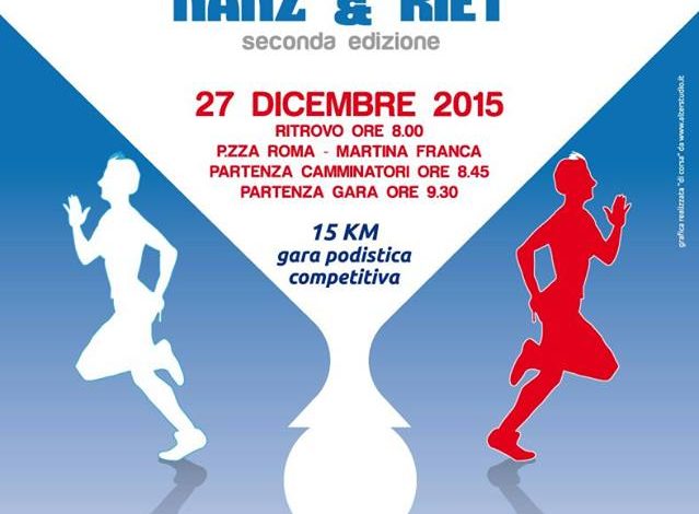 Sarà una gara da vivere tutta d’un fiato quella che chiuderà ufficialmente l’anno podistico della provincia jonica, e non solo. La Martina Franca – Locorotondo “Nanz&Riet” che si svolgerà domenica 27 dicembre 2015 è alla sua seconda edizione, ma è già un appuntamento attesissimo da parte dei podisti non solo locali, ma provenienti da tutta la Puglia (e oltre). Sono 969 gli iscritti alla gara, provenienti da tutta la Puglia, oltre a un centinaio di camminatori, e si attendono altri numerosi concorrenti dell’ultima ora. Come già preannunciato, la gara si arricchisce quest’anno con la presenza di Giorgio Calcaterra, tre volte campione del mondo nella 100 km, dieci volte trionfatore nella mitica 100 km del Passatore. Sarà presente anche un altro campione pluri-decorato: Michele Giurgola, da Ruffano, campione del mondo di apnea Assetto Costante Bipinne 2015. Altro illustre concorrente, martinese doc, è l’arbitro di calcio di serie A, Angelo Cervellera. A percorrere di corsa i 15 chilometri tra trulli, ulivi e macchia mediterranea, “a piedi”, stavolta, ci sarà anche il vice-campione d’Europa di formula tre, Antonio Giovinazzi, pilota martinese che si è distinto quest’anno sulle piste europee. La manifestazione sportiva, organizzata dal gruppo Palestra Marathon Martina Franca, gode del patrocinio dei Comuni di Martina Franca e di Locorotondo, e prevede una gara competitiva, riservata ad atleti Fidal, ma anche una non competitiva, aperta ai liberi, oltre a una competizione dedicata ai “camminatori veloci”. Raduno alle 8.00 in piazza Roma e partenze alle ore 9.30 da Piazza XX settembre, con arrivo in piazza Umberto. Ristoro finale con l’immancabile panino al capocollo e bocconotto, caratteristico dolce martinese. Premi di categoria e prestigiose medaglie ai primi classificati, coniate per l’occasione su disegno personalizzato. Insomma, 15 chilometri di emozioni da vivere tutte d’un fiato. Buona corsa a tutti.