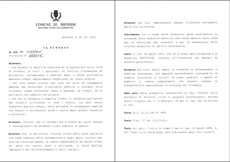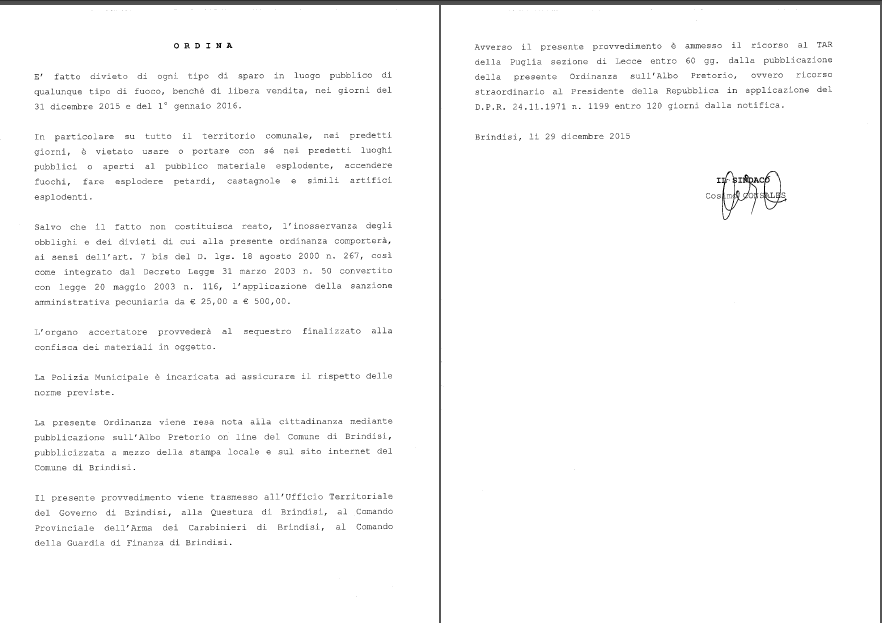 Con l’avvicinarsi delle festività di capodanno, anche a Brindisi spunta l’ordinanza emessa dal Comune che vieta l’accensione di ogni tipo di artificio pirotecnico per scongiurare danni a cose, persone, con particolare riguardo ai minorenni, e animali.