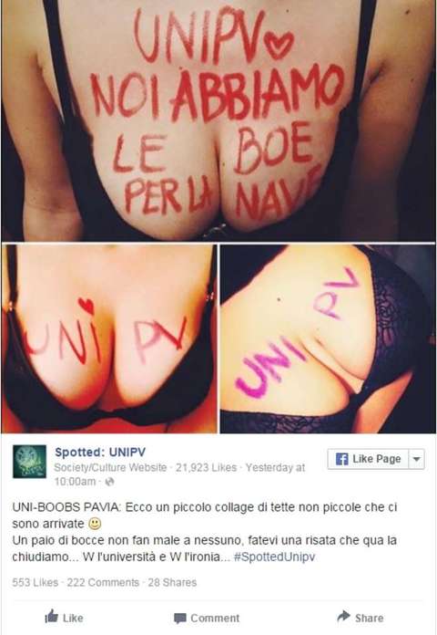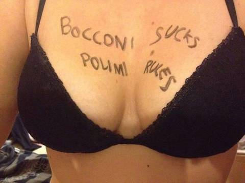 Sono milanesi e da una settimana si stanno sfidando sui social a suon di scatti sexy e foto hot sulla scia del tormentone #Escile. Una carrellata di scollature, reggiseni e mutandine che è stata lanciata sui profili Facebook ‘spotted’ delle principali università meneghine. (i profili social di scuole e università dove gli studenti fanno segnalazioni o vanno alla ricerca della ragazza o del ragazzo avvistato in aula). Prima sono arrivati quelli del Politecnico di Milano, poi quelli della Statale, della Bocconi e della Cattolica. Un successo incredibile, che un seno e l’altro sta conquistando la rete, dove c’è già chi ha promosso l’iniziativa a pieni voti, ritendendola “DA APPLAUSI!” e chi pensa che la trovata non sia altro che “Un’automercificazione del corpo”. E tra i cuoricini e i nomi delle università scritte con il pennarello sopra petti e posteriori femminili, per par condicio fanno capolino anche pettorali e torsi glabri dei maschietti compagni di corso.”È un po’ come in un mercato concorrenziale – scrive il gestore della pagina ‘Spotted Bocconi Milano’, lasciandosi andare a riflessioni di macroeconomia – inizialmente tette sotto una maglietta; poi, per conquistare una maggiore fetta di mercato, un competitor toglie la maglietta, ma lascia il reggiseno; dopodichè la pressione competitiva sprigiona tutta la sua forza e anche il reggiseno va via, ma rimane un pò di panna. Oggi è un momento in cui dovremmo unirci per ripensare la microeconomia”. E a chi storce il naso accusandoli di esibizionismo gratuito e di cattivo gusto, la risposta è sempre la stessa: “Fatevi una risata”.