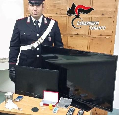 I militari della Stazione Carabinieri di Ginosa (TA), nel corso di un servizio finalizzato al contrasto di reati contro il patrimonio, hanno denunciato in stato di libertà all’Autorità Giudiziaria del capoluogo jonico, per ricettazione e detenzione ai fini di spaccio di sostanze stupefacente un 38enne, pregiudicato del posto. L’uomo, a seguito di perquisizione domiciliare eseguita all’interno della sua abitazione, veniva trovato in possesso di due televisori LCD che, da ulteriori accertamenti risultavano provento di furto perpetrato nel mese di febbraio 2015 ai danni di una struttura alberghiera del posto. Nel corso delle operazioni, gli operanti rinvenivano, altresì, gr 4 circa di hashish, una dose di eroina, un bilancino di precisione e materiale vario per il confezionamento dello stupefacente. Il 38enne, al termine delle formalità di rito, è stato denunciato in stato di libertà per ricettazione e detenzione ai fini di spaccio di sostanza stupefacente, mentre la refurtiva, del valore commerciale di € 1.500,00 circa, verrà restituita al legittimo proprietario. Lo stupefacente è stato invece sequestrato per le successive analisi quali-quantitative presso il Laboratorio Analisi Sostanze Stupefacenti del Comando Provinciale Carabinieri di Taranto.