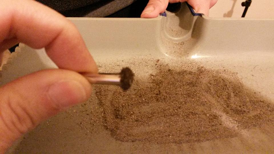 Sono le foto di un abitante non dell’ormai conosciutissimo rione Tamburi, quello che si estende a ridosso dello stabilimento siderurgico di Taranto. Le foto immortalano ciò che i tarantini dell’intera provincia continuano a respirare: minerale di ferro raccolto da terra dopo aver spazzato semplicemente un balcone di una casa privata. La calamita utilizzata per separare la polvere dal minerale ne è la prova.