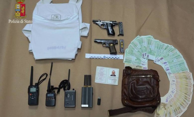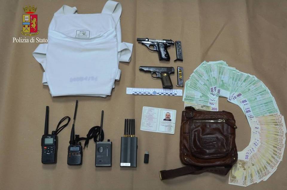 Nel corso della perquisizione i poliziotti recuperavano due pistole: una “Beretta” calibro 7.65,ed un’altra di fabbricazione tedesca dello stesso calibro. Entrambi le armi avevano la matricola abrasa e il caricatore inserito. Inoltre venivano recuperati 10.000 euro in banconote di grosso taglio , un giubbotto antiproiettile, due ricetrasmettitori, , un localizzatore di microspie ed una carta d’identità falsa, valida per l’espatrio.