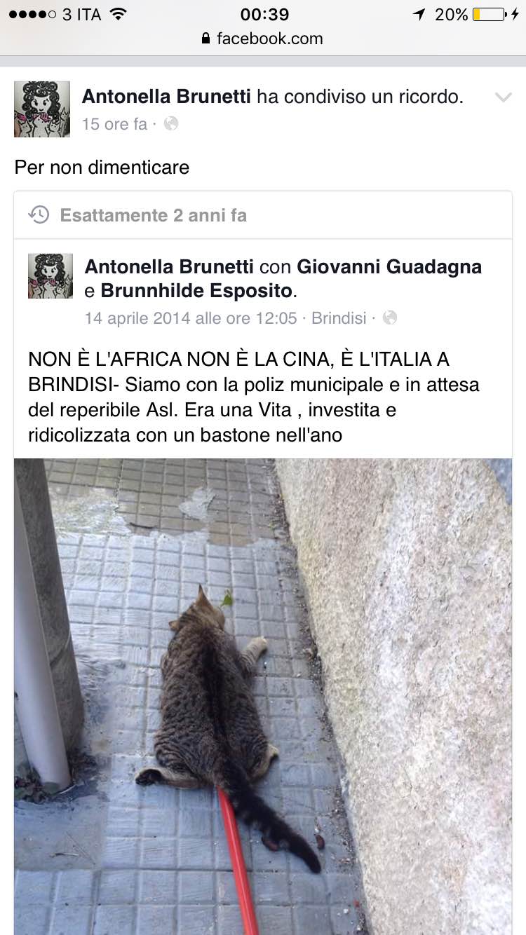 Il legale rappresentate dell’AIDAA, l’avvocato Antonella Brunetti, in merito alla notizia da noi pubblicata il 16/04/2016 riguardante l’increscioso e crudele episodio che ha visto un gatto impalato con un manico di scopa, chiede la rettifica del pezzo in quanto, precisa la professionista, “come da screenshot allegato, il fatto è stato notiziato all’autorità giudiziaria con annesso sopralluogo dei sanitari nell’anno 2014.” e non nel 2016 come riportato nell’articolo.