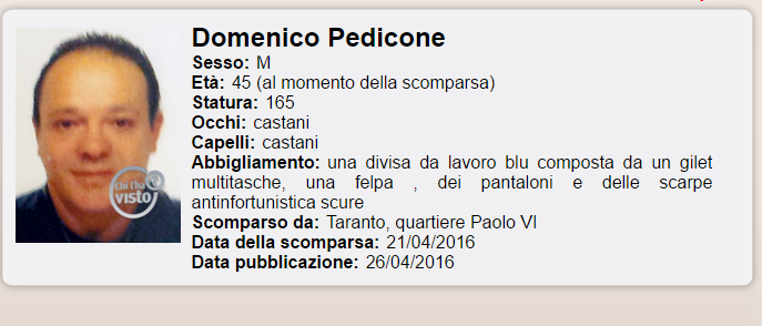 Al momento della scomparsa, Pedicone indossava una tuta da lavoro blu.