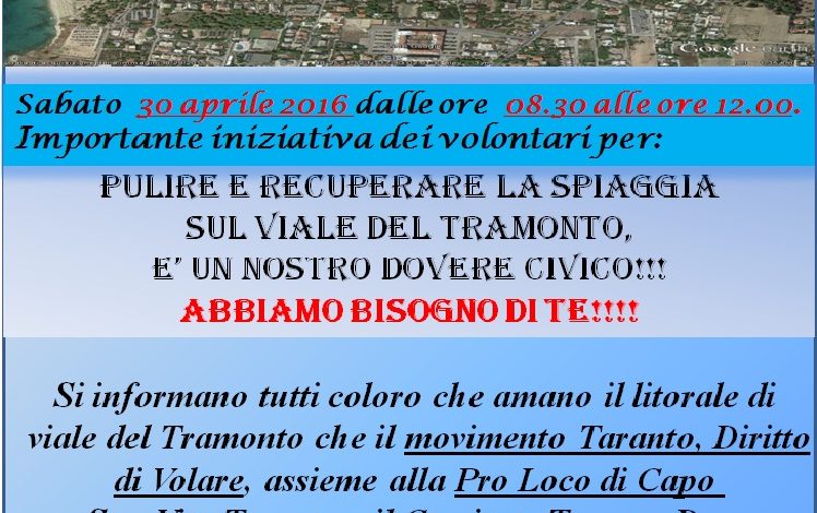 Giorno 30 aprile 2016, dalle 08.30 alle 12.00, il movimento TARANTO, DIRITTO DI VOLARE, assieme alla Pro Loco Capo San Vito di Taranto e il Comitato Cittadino TARANTO DUE e tutti coloro i quali vogliono intervenire, si attiveranno volontariamente, a pulire la spiaggia e la parte costiera sul viale del Tramonto.