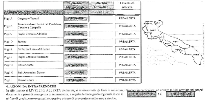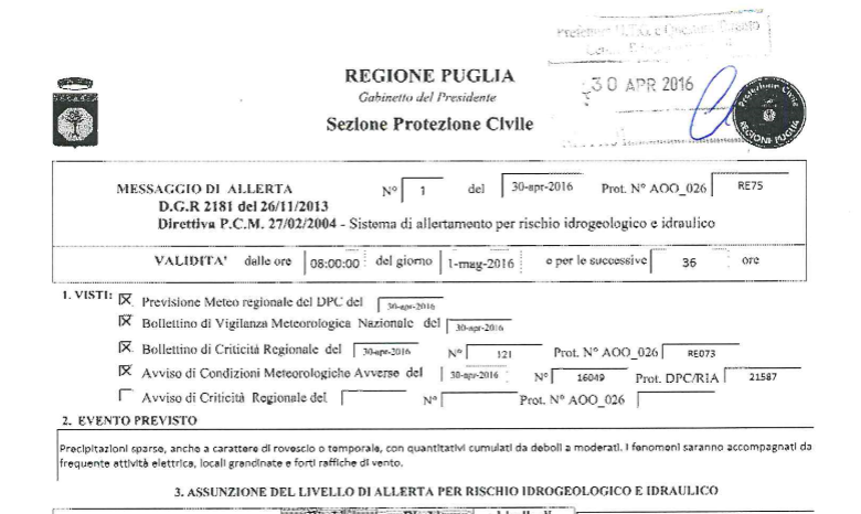 Diramato dalla Prefettura di Taranto un avviso per avverse condizioni meteo, a partire dalle 8.00 di domani mattina 1 maggio 2016 e a seguire per le successive 36 ore. Tra i fenomeni previsti: precipitazioni sparse anche a carattere di rovescio o temporale, con quantitativi cumulati da deboli a moderati. I fenomeni saranno accompagnati da frequente attività elettrica, locali grandinate e forti raffiche di vento.