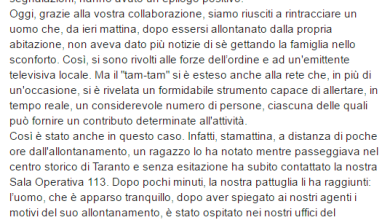 Taranto – Ritrovato l’uomo scomparso. Lo annuncia la Polizia