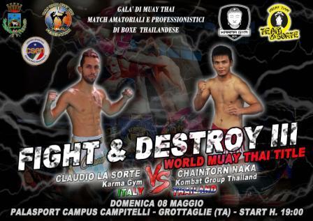 Il FIGHT & DESTROY III, avrà in programma diversi show nell’ambito dello stesso galà. Si partirà al mattino,  start  alle ore 11 con l’OPEN, nel corso del quale 60 fighters, con età tra i 5 e i 35 anni, si esibiranno nelle discipline di Muay Thai,   K1-Kick Boxing e Boxe a carattere amatoriale. A partire dalle 19 il galà serale, che prevede 7 match di Muay Thai di cui 5 semi-professionistici che si incontreranno senza caschetto ma con l’uso di paratibie e paragomiti, mentre gli ultimi due match saranno da professionisti con 5 round da 3 minuti senza alcuna protezione.  In palio per questi ultimi due incontri il titolo italiano pro – 67 kg fra Rotunno (Altamura) e De Luca (Termoli) ed il titolo mondiale pro -58 KG fra Italia e Thailandia. A rappresentare i colori azzurri per il titolo mondiale ci sarà il grottagliese Claudio La Sorte, già campione nazionale.