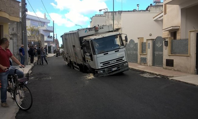 Lecce – Cede l’asfalto e sprofonda camioncino dei rifiuti. Paura tra i passanti