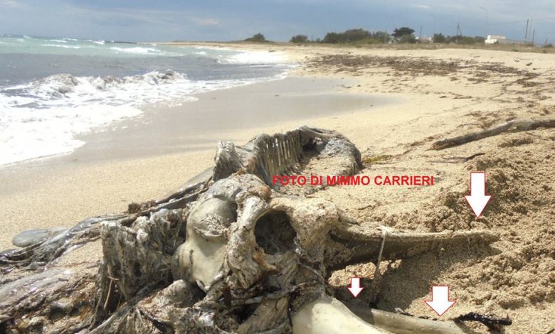 Oggi pomeriggio sulla battigia di “Palmintello” é stata trovata spiaggiata una carcassa scheletrita di un animale marino appartenente ad una specie indefinibile alquanto strana.