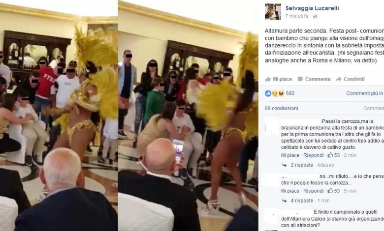 Selvaggia alla riscossa su Facebook. Dopo il commento che l’opinionista più discussa della TV aveva lanciato sul social circa l’immagine di una ragazzina di Altamura accompagnata in chiesa su di un “sobrio” calesse durante la sua prima comunione, e che aveva sollevato critiche e polemiche sul web, la graffiante Lucarelli torna a colpire ancora. E sempre ad Altamura. Questa volta prende di mira la foto scattata durante il post-comunione di un bambino, al quale qualcuno ha pensato bene di regalare una spettacolare esibizione di brasiliane in perizoma: