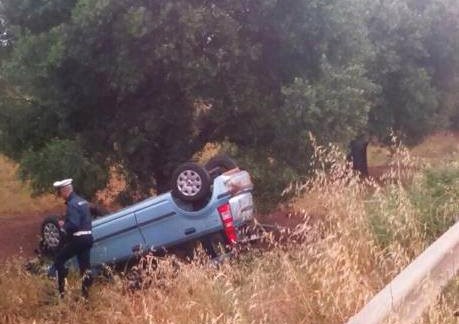 L’auto, forse a causa del manto stradale reso viscido dalla pioggia, è uscita fuori strada, cappottandosi in un terreno adiacente la provinciale.