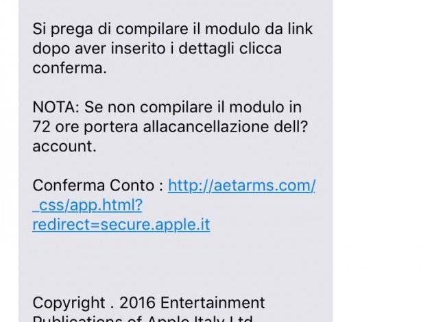 Attenzione, agli SMS truffa “by Apple”.Come testimoniato da diversi utenti, da qualche settimana anche in Italia vengono inviati SMS truffa il cui mittente fasullo è Apple. Fate attenzione e non cliccate su alcun link!In questi SMS (GUARDA FOTO)viene chiesto di cliccare su un apposito link per disdire acquisti iTunes che vanno dai 40 ai 70 euro. Chiaramente si tratta di acquisti mai effettuati dal destinatario del messaggio, ma il fatto che il destinatario sia “Apple Support” può trarre in inganno diverse persone.Un altro SMS, questa volta in italiano (tradotto male…), chiede di cliccare sul link per aggiornare il database degli utenti Apple, pena la cancellazione definitiva del nostro account.In entrambi i casi si tratta di truffa, e ricordate che Apple non invia MAI messaggi di questo tipo, né via SMS, né via e-mail.
