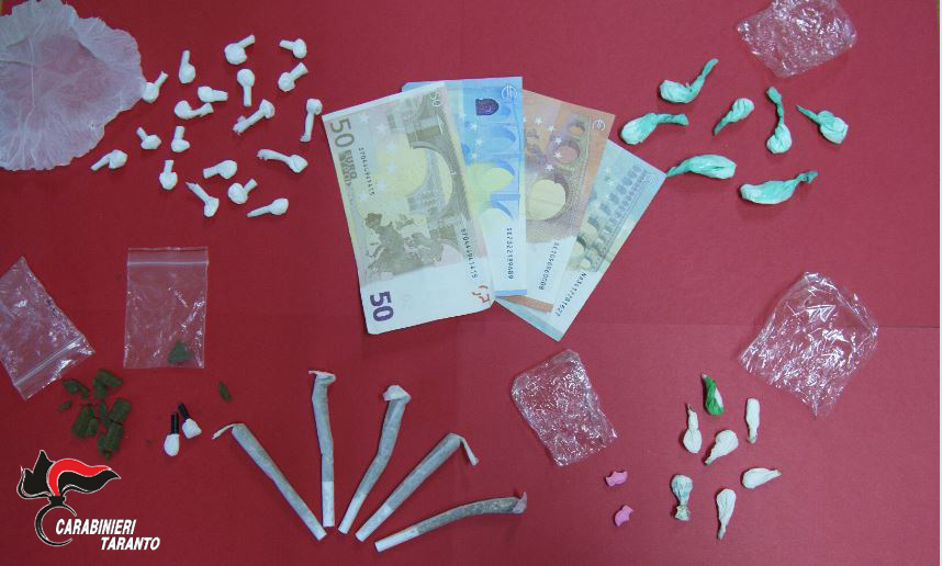 – un 20enne di Ginosa e un 24enne di Sannicandro di Bari, entrambi incensurati, invece, sono stati denunciati in s.l. all’A.G., in quanto trovati in possesso rispettivamente di 7 involucri contenenti gr. 3,00 di metanfetamina denominata “speed”, 2 pasticche di ecstasy e di 2 dosi di MD e vari frammenti di hashish per un peso complessivo di gr. 1,00.