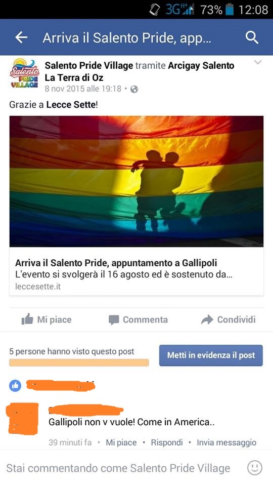 Paroloni volati per aria quelli, dunque, sul Pride Salentino, pensiero condiviso o burla di un troll simpaticone poco importa, il commento non è piaciuto a molti e l’autore dello stesso ha pensato bene quindi di rimuoverlo. Il fatto non è passato comunque inosservato.