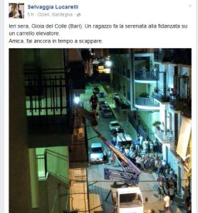 Bari- Serenata d’amore su un carrello elevatore. Selvaggia Lucarelli ironizza: “Amica, fai ancora in tempo a scappare”