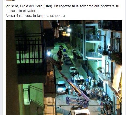 Un chiaro esempio si sarebbe verificato ieri a Gioia del Colle, sotto gli occhi curiosi degli amici e dei parenti di una giovane coppia del posto prossima alle nozze. Per amore della sua promessa sposa, l’impavido innamorato, la notte prima del matrimonio, si è recato sotto il balcone della sua amata per la consueta serenata, proprio come vuole la tradizione, con un cordone di curiosi al seguito. Certo, forse l’altezza, secondo-terzo piano, avrebbe impaurito qualcuno, ma questo non è il nostro caso.