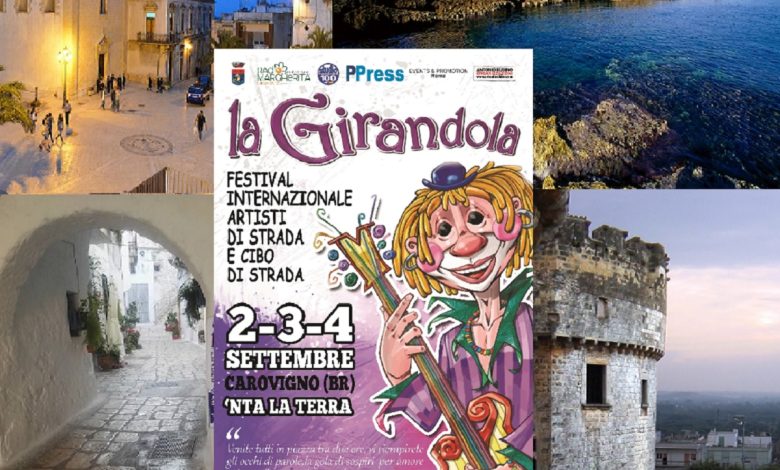 “NTA LA TERRA”, così viene chiamato il meraviglioso centro storico di Carovigno, in provincia di Brindisi, uno dei borghi più belli dell’alto Salento, con un mare bellissimo quello di Torre Santa Sabina, una riserva naturale come Torre Guaceto, a pochi chilometri dalla Città Bianca di Ostuni. Carovigno, ospiterà il Festival Internazionale di Artisti di Strada LA GIRANDOLA, organizzato dalla Events & Promotion di Roma e da Antonio Rubino Organizzazioni, dal 2 al 4 settembre 2016. Dieci postazioni, all’interno del centro storico di dieci spettacoli di artisti di strada, selezionati tra centinaia di richieste di partecipazione, uno dei quali potrà vincere un premio di 1000 euro messo in palio dal Comune di Carovigno. Ecco i finalisti: Biling Circus, Maison du Theatré, Michela Nagy, Giocole Reggio, Niccolò Nardelli, Psycodummers, Raffael Sorryso, Roberto Rigitano, Sara Cambi, Yin e Yamg.Tra le dieci postazioni, una all’interno del Castello Dentice di Frasso di Carovigno. Oltre agli artisti, anche il cibo di strada, con prodotti rigorosamente selezionati della migliore tradizione pugliese. Patrocinio dell’Assessorato al Turismo della Regione Puglia, La Girandola è tra gli eventi italiani capaci di attirare migliaia di famiglie provenienti da ogni parte d’Italia, grazie ad una imponente campagna pubblicitaria nazionale. Tre giorni del primo weekend di settembre che consentiranno una coda alle proprie vacanze, coniugando mare, collina, sapori e, soprattutto, tanto divertimento per i bambini. Quella di Carovigno sarà infatti la vacanza ideale per i più piccoli. Convenzioni con alberghi, residence e B&B renderanno la vacanza molto più piacevole. La Girandola che ha proprio nel bellissimo giocattolo colorato spinto dal vento il suo logo, dopo aver in passato contribuito a realizzare dei pozzi d’acqua e un panificio in Burkina Faso, quest’anno ha come obiettivo un progetto in Congo. Info 3934600600