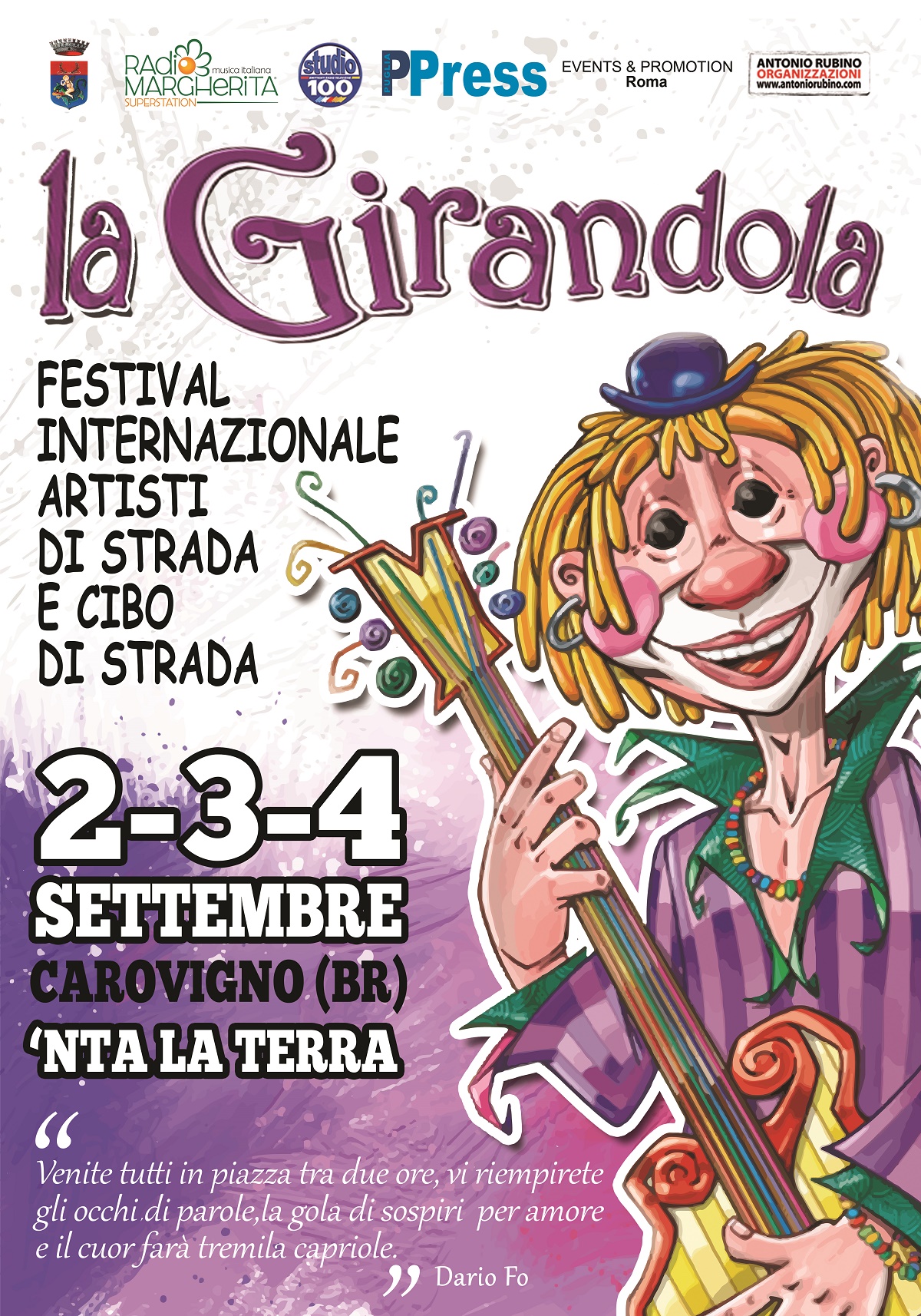Da stasera, per tre giorni, il bellissimo centro storico i Carovigno, denominato tradizionalmente “NTA LA TERRA”, messo a festa dall’Amministrazione comunale con il concorso Vicoli fioriti, diventa palcoscenico ideale del Festival Internazionale di Artisti di Strada “LA GIRANDOLA”, organizzato dalla Events & Promotion di Roma e da Antonio Rubino Organizzazioni. Carovigno in provincia di Brindisi è uno dei borghi più belli dell’alto Salento, con un mare bellissimo quello di Torre Santa Sabina, una riserva naturale come Torre Guaceto, a pochi chilometri dalla Città Bianca di Ostuni. Dal 2 al 4 settembre dieci postazioni, all’interno del centro storico con altrettanti spettacoli di artisti di strada che si esibiranno dalle 18 alle 24, selezionati tra centinaia di richieste di partecipazione, uno dei quali potrà vincere un premio di 1000 euro messo in palio dal Comune di Carovigno. Ecco i finalisti: Biling Circus, Maison du Theatré, Michela Nagy, Giocole Reggio, Niccolò Nardelli, Psycodummers, Raffael Sorryso, Yin e Yamg, Matteo Grossi. Tra le dieci postazioni, una all’interno del Castello Dentice di Frasso di Carovigno, risalente al periodo Normanno. Oltre agli artisti, anche il cibo di strada, con prodotti rigorosamente selezionati. Patrocinio dell’Assessorato al Turismo della Regione Puglia, La Girandola è tra gli eventi italiani capaci di attirare migliaia di famiglie provenienti da ogni parte d’Italia, grazie ad una imponente campagna pubblicitaria nazionale. Tre giorni del primo weekend di settembre che consentiranno una coda alle proprie vacanze, coniugando mare, collina, sapori e, soprattutto, tanto divertimento per i bambini. Ingresso e parcheggi con un servizio navetta su un suggestivo trenino che accompagnerà il pubblico dalle aree parcheggio al centro storico. Infine degli spazi artigianali dove sarà possibile fare shopping. Quella di Carovigno sarà la vacanza ideale per i più piccoli. Convenzioni con alberghi, residence e B&B renderanno la vacanza molto più piacevole. La Girandola che ha proprio nel bellissimo giocattolo colorato spinto dal vento il suo logo, dopo aver in passato contribuito a realizzare dei pozzi d’acqua e un panificio in Burkina Faso, quest’anno ha deciso di fare degli spettacoli denominati “LA CONTRORA DELLA GIRANDOLA” a mezzogiorno di sabato e domenica sulla spiaggia di Torre Santa Sabina per sensibilizzare la donazione di 2 euro al numero della protezione civile 45500 in favore dei terremotati del Centro Italia. La Girandola può iniziare a soffiare.