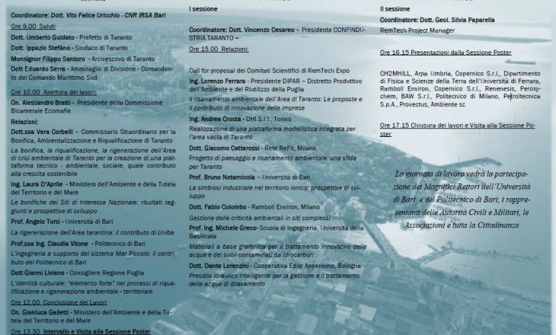 La giornata di lavoro è stata organizzata dal Commissario Straordinario per la Bonifica, Ambientalizzazione, Riqualificazione di Taranto, dott. Vera Corbelli, in collaborazione con Remtech2016 – Remediation Technologies.