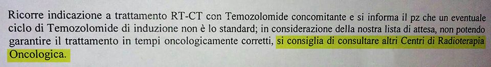 Grazie alla segnalazione di un paziente affetto da Astrocitoma di II e III grado (come si legge in foto allegata) si è venuti a conoscenza del fatto che quando il reparto è in sovraffollamento i pazienti possono essere invitati a curarsi presso altre strutture (foto allegata).