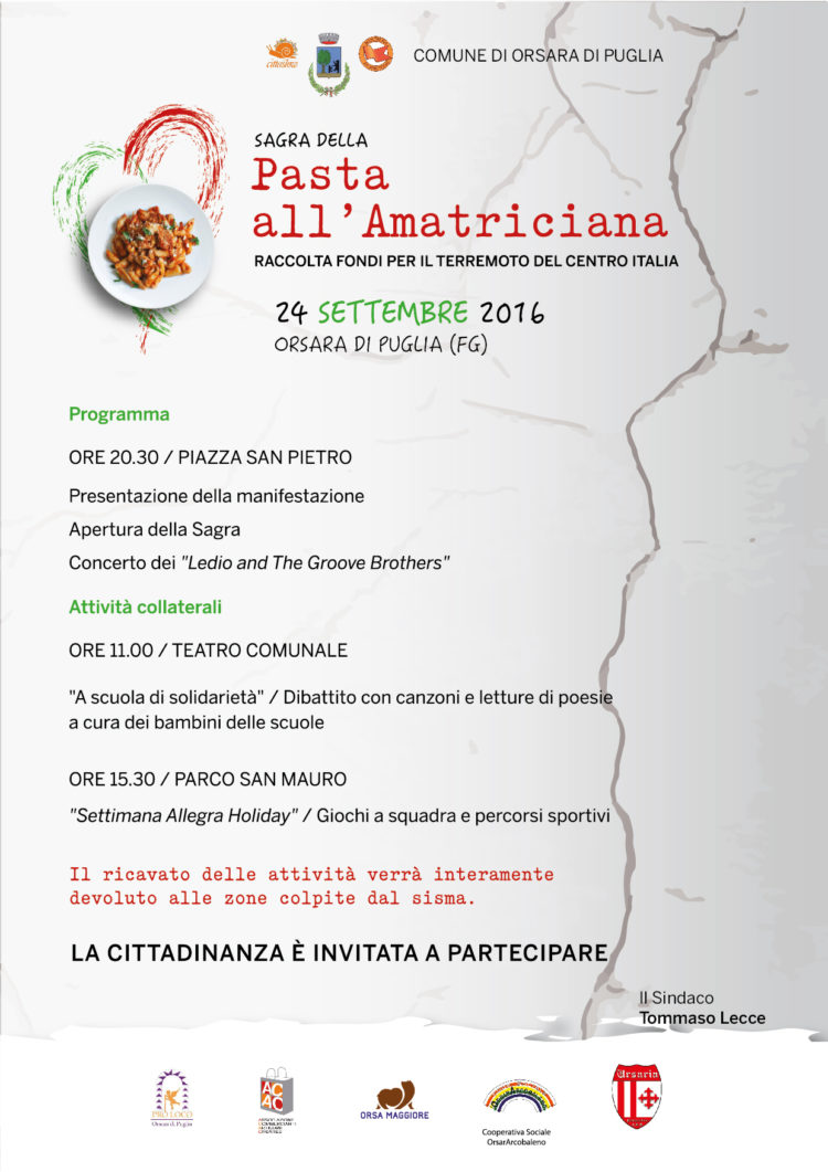 Un intero sabato dedicato alla solidarietà, in favore delle popolazioni colpite dal sisma dello scorso 24 agosto. Orsara di Puglia, il prossimo 24 settembre, ad un mese esatto dal terremoto del centro Italia, organizza la “Sagra della Pasta all’amatriciana”, con il ricavato della manifestazione, che sarà interamente devoluto in beneficenza. Sport, poesia, musica, gastronomia, tutta la giornata sarà dedicata ad iniziative ricreative, culturali, che allieteranno la giornata nel delizioso comune dei Monti Dauni meridionali. L’evento è organizzato dal Comune di Orsara di Puglia, in collaborazione con la Pro Loco e l’Istituto Scolastico Comprensivo “Virgilio”. “Ancora una volta, col terremoto di un mese fa, è stata colpita con tragica durezza la spina dorsale del Paese, l’Italia dei borghi dell’entroterra, quella che ancora conserva, tutela e valorizza il grande patrimonio italiano rappresentato dalla cultura contadina e da valori senza tempo”, ha dichiarato il sindaco di Orsara di Puglia, Tommaso Lecce. “L’iniziativa del 24 settembre vuole essere il nostro modo di manifestare la vicinanza della Comunità orsarese ai paesi colpiti dal sisma”. Alle parole del primo cittadino si aggiungono quelle del vicesindaco Rocco Dedda, assessore con delega alla Cultura e ai Giovani: “Il collante tra Comune, scuola e associazioni è molto importante, perché ci permette di organizzare un’iniziativa che sensibilizza e fa formazione su temi di grande rilievo come la solidarietà e la prevenzione del rischio sismico, provando a fornire un aiuto concreto a chi sta lottando per ricostruire la propria vita”. Una bella iniziativa dunque, che meriterebbe l’attenzione dei mass-media nazionali, perché è davvero meritevole di attenzione, vuoi per l’atto di solidarietà, vuoi perché in grado di valorizzare tutto l’apparato gastronomico e artistico, non solo di Orsara, ma di tutta la comunità dei Monti Dauni. Popolo fiero, a volte schivo, ma solidale e carico di umanità.