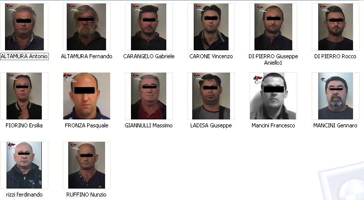 Gennaro, la misura degli arresti domiciliari a carico di GIANNULLI Massimo, DI PIERRO Aniello Giuseppe e la misura dell’obbligo di dimora a carico di CARONE Vincenzo, FORINO Ersilia, ALTAMURA Antonio, DI PIERRO Rocco e CARANGELO Gabriele. Mentre non veniva contestato il reato associativo per LADISA Giuseppe, sottoposto agli arresti domiciliari per tentata estorsione in concorso, e ALTAMURA Fernando sottoposto all’obbligo di dimora per il reato di usura in concorso.