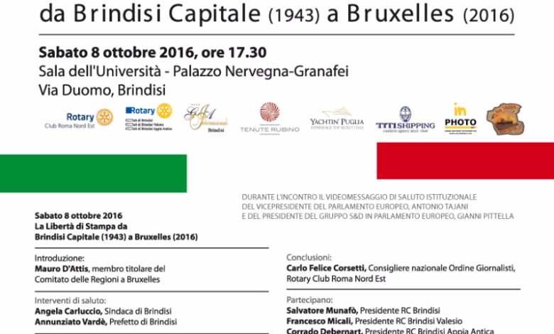 Di questo momento storico, che aprirà le porte alla riaffermazione della democrazia in Italia, si parlerà sabato 8 ottobre, alle 17.30, nella sala Università del Palazzo Granafei-Nervegna. L’incontro rappresenta la continuazione ideale di quello avvenuto nei giorni scorsi a Bruxelles dove è stato celebrato proprio il momento storico in cui a Brindisi rinacque la libertà di stampa in Italia.