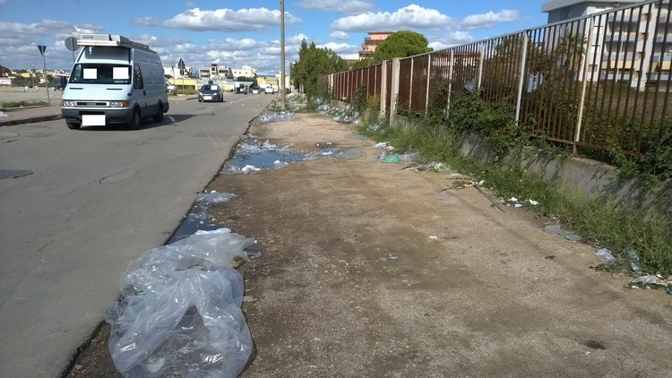 Mediamente nel pomeriggio (non sempre), per esempio oggi pomeriggio, non sono intervenuti i mezzi e gli uomini dell’AMIU per la pulizia delle strade e della piazza mercato. Non voglio assolutamente mettere in evidenza l’eventuale ritardo dell’Amiu, voglio invece, mettere in seria evidenza, l’incuranza di alcuni commercianti ambulanti, nel lasciare buste di plastica e carte per terra. Nel caso ci sia forte vento, questi, vanno da tutte le parti, come in precedenza spiegavo. Poi, tocca agli operatori ecologici, impazzire nel raccogliere nei posti più assurdi, le buste di plastica, carta e altro spostate dal vento. Comprendo che il servizio di pulizia è giustamente reclamato ed è fatto proprio perché, mediamente i mercati rionali, frequentato da migliaia di persone, creano della sporcizia, ciò che non comprendo è il totale menefreghismo nell’abbandonare questi. Basterebbe disporre da chi gli compete, di far organizzare i commercianti dei banchetti nel munirsi di sacchetti (contenitori) entro cui riversare gli scarti delle vendite e quant’altro, sotto la supervisione delle autorità competenti che già provvedono al controllo delle autorizzazioni per l’esercizio delle attività e a l’emissione degli scontrini. Al termine, tutti, dico tutti devono riversare questi nei cassoni appropriati. Eventualmente, per l’occasione, rafforzare il numero dei cassoni, per permettere di accogliere tutto, ed evitare situazioni come quelle messe in evidenza (foto).