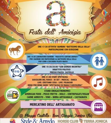 amiciziaIl 22 ottobre si terrà in San Giorgio Ionico presso Piazza Carro di Tespi e zone limitrofe, la 1° edizione provinciale della festa dell’Amicizia organizzata dall’UDC di San Giorgio Jonico.