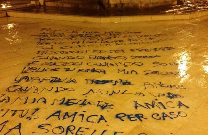 “La mia migliore amica sei tu. Amica per caso, sorelle per sempre”. L’amore di questa ragazzina per la sua migliore amica, in occasione – probabilmente – del suo tredicesimo compleanno sicuramente è forte. La dedica avrebbe potuto essere sicuramente ancora più bella e preziosa, se scritta su di un biglietto. Per due motivi essenzialmente: il primo, perché il biglietto si può conservare; il secondo, perché si sarebbe evitato lo scenario di degrado assoluto che “decora” Piazza Fontana, in città vecchia. La foto che vedete e della quale stiamo parlando, ha fatto il giro del social, condivisa dalla Pagina Facebook “Taranto è lui” e ricevendo non i consensi che la ragazzina si sarebbe aspettata. Episodi di questo genere sono sempre più frequenti tra i giovani e non solo a Taranto. Si è passati da cartelloni, striscioni, lenzuola, all’imbrattare muri, asfalto, panchine, e in questo caso una fontana. Adesso chi pulirà i marmi della fontana dalla vernice spray? E soprattutto, chi vigila affinché tutto ciò non accada? Talvolta il concetto di degrado non è colto appieno e soprattutto, non si limita alla cartaccia per strada, o alle erbacce lungo i marciapiedi. Degrado è anche compiacersi di episodi del genere, e non far nulla per evitarli.
