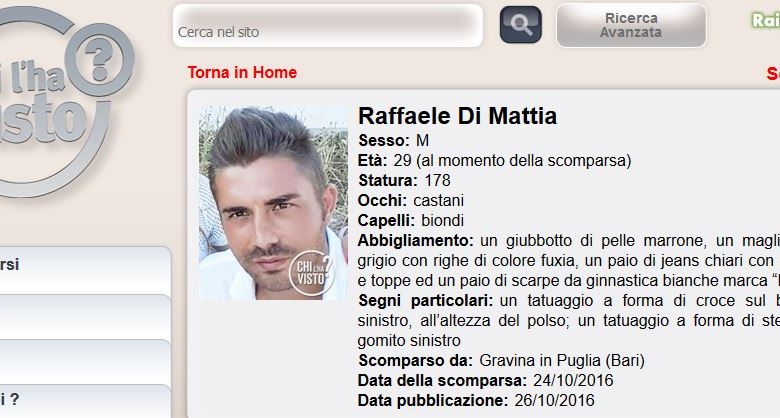 Anche la pagina Facebook della nota trasmissione Rai “Chi l’ha visto” proprio in questi minuti ha pubblicato la scheda riguardante Di Mattia.