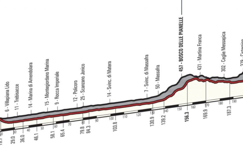 Tappa per velocisti quasi interamente pianeggiante. Dopo una partenza in leggera discesa si percorre tutta la costa che dalla Calabria lungo la Basilicata conduce in Puglia. Lasciata ala ss.106 si sale a Massafra per poi toccare le maggiori località della Valle d’Itria con un percorso articolato, ma pianeggiante per una probabile volata di gruppo.