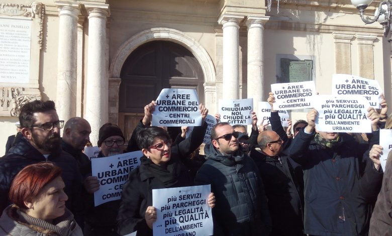 Taranto – Protesta dei commercianti sotto Palazzo di Città: «Più aree urbane del commercio, meno centri commerciali»
