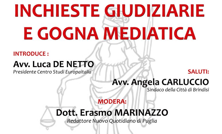 Il Centro Studi Internazionale EUROPAITALIA, in collaborazione con la Camera Penale di Brindisi e il Patrocinio del Comune di Brindisi, ha organizzato per venerdì 2 dicembre 2016 una conferenza sul tema “Inchieste giudiziarie e gogna mediatica”, per la quale è in corso l’accreditamento quale evento formativo riconosciuto dall’Ordine degli Avvocati della Provincia di Brindisi. L’appuntamento è alle ore 17,30 presso la sala conferenze di Palazzo Narvegna: ad introdurre i lavori sarà l’Avv. Luca De Netto, Presidente del Centro Studi Europaitalia, e, dopo i saluti del Sindaco della Città di Brindisi, Avv. Angela Carluccio, si confronteranno l’Avv. Fabio Di Bello, Presidente della Camera Penale “O. Melpignano” di Brindisi, e il Dott. Giuseppe Capoccia, Procuratore della Repubblica di Crotone. A moderare l’interessante e vivo dibattito, il Dott. Erasmo Marinazzo, Redattore del Nuovo Quotidiano di Puglia ed esperto di cronaca giudiziaria.