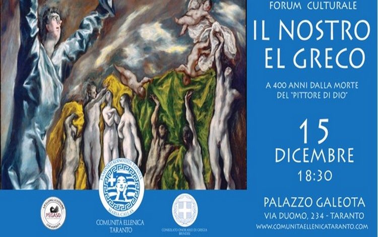 Costituita da pochi mesi la Comunità Ellenica di Taranto “MARIA CALLAS”. Per una comunità di greci, la città di Taranto, antica capitale della Magna Grecia, costituisce un luogo ideale perché luogo che ha dato storicamente i natali a tanti intellettuali ed artisti dell’epoca ellenistica. La neonata comunità è un organo istituzionale ufficiale per i greci della diaspora ed ha come obiettivo la promozione della cultura, dell’arte e della musica greca, con lo scopo di consolidare, rinvigorire ed ampliare gli antichissimi legami tra il popolo greco e quello italiano. Il primo evento celebrativo, nell’ambito delle iniziative di promozione e diffusione della cultura greca nella provincia tarantina, si terrà il prossimo 15 dicembre, alle ore 18.30, a Palazzo Galeota. L’iniziativa riceve il Patrocinio del Consolato Onorario di Grecia di Brindisi e si svolge in collaborazione con l’Università Telematica Pegaso di Taranto. L’argomento trattato nel Forum Culturale sarà dedicato al pittore conosciuto come “El Greco”, proprio in concomitanza con la commemorazione dei 400 anni dalla scomparsa di Dominikos Theotokopoukos (Candia 1541-Toledo 1614), detto El Greco e definito “IL PITTORE DI DIO”.