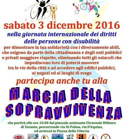 Tutto pronto per la “Marcia della sopravvivenza”, l’evento organizzato da nove associazioni di Taranto per la mattinata di domani, sabato 3 dicembre, in occasione della Giornata Internazionale delle Persone con Disabilità.