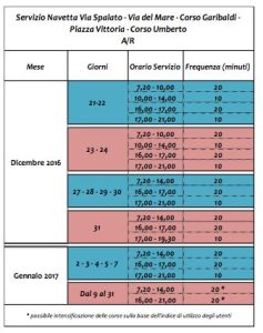 La frequenza delle corse è variabile tra 10 e 20 minuti, a seconda delle fasce orarie e delle giornate, anche in relazione al periodo natalizio, nel quale è atteso un maggior afflusso di utenti verso il centro urbano.