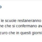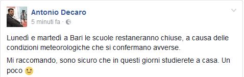 “Lunedì e martedì a Bari le scuole restaneranno chiuse, a causa delle condizioni meteorologiche che si confermano avverse.” scrive il sindaco, poi continua – Mi raccomando, sono sicuro che in questi giorni studierete a casa. Un poco”
