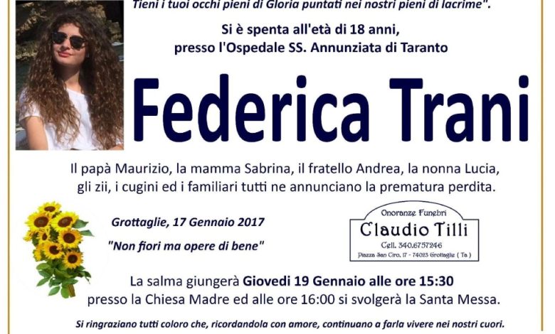 Si svolgeranno nel pomeriggio di domani alle ore 16.00 presso la Chiesa Madre di Grottaglie i funerali di Federica Trani, la 18enne che ha perso la vita a causa di un incidente in moto .