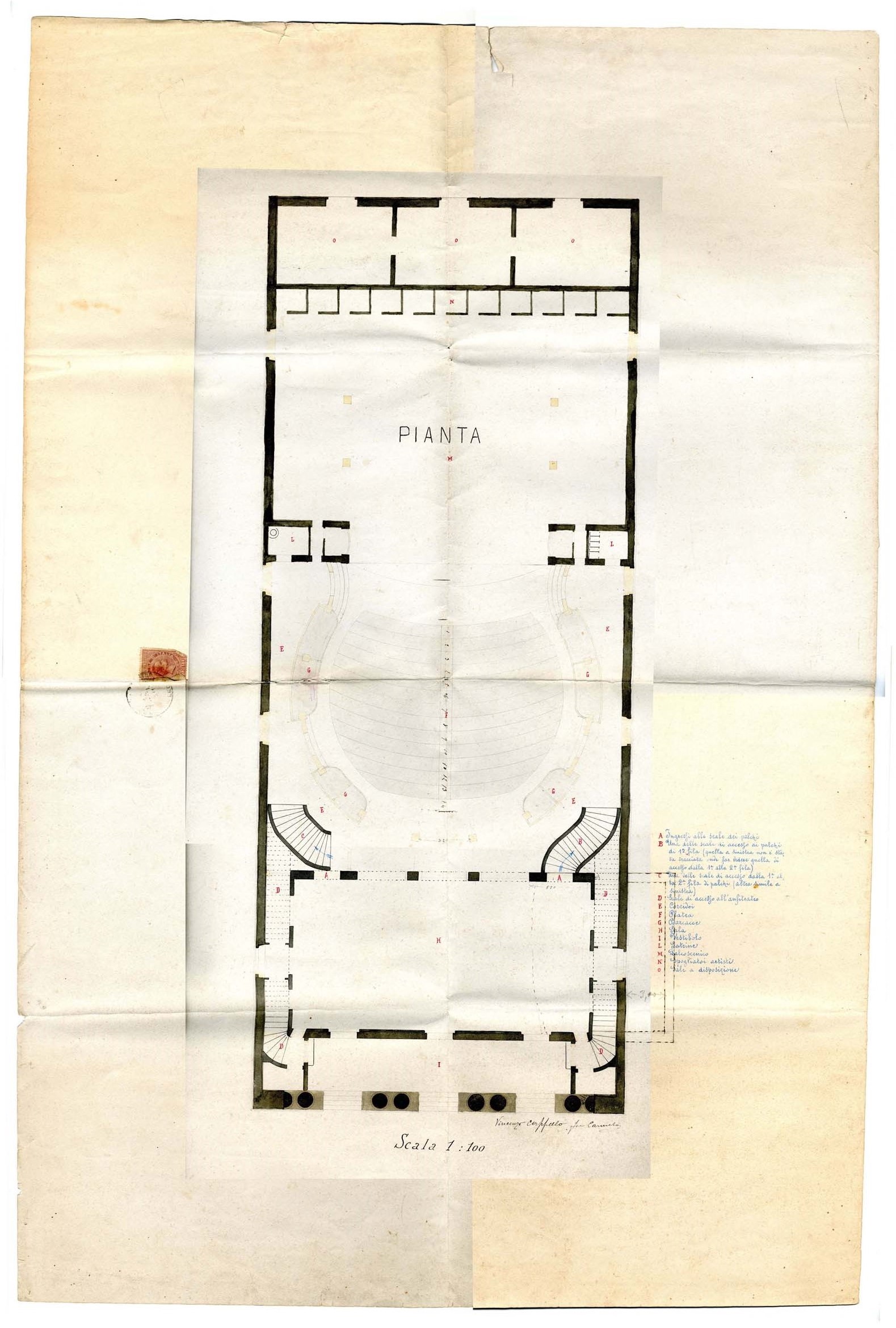 All’interno del disegno, in ciascun vano, le indicazioni delle destinazioni d’uso: a china nera, a stampatello maiuscolo, in alto al centro: “Corridoio di disimpegno”; da sinistra a destra e dall’alto in basso, ruotati di 90°, a china nera su due righe di testo a stampatello: “Deposito bagagli / Compagnia”, “Camerini / Artisti”; procedendo verso destra: testo a stampatello maiuscolo, ruotato di 90°, a china nera su due o più righe, dall’alto in basso: “Camerini / Artisti”, “Camerini / Artisti”, “Scala per / soffitta / e / Porta Sicurezza / Loggione”, “Camerini / Artisti”, “Camerini / Artisti”; a china nera, in orizzontale, sottosopra rispetto all’orientamento principale della tavola, su una sola riga di testo a stampatello: “Praticabile per la Soffitta”; subito sotto, al centro, a china nera, a stampatello maiuscolo, ruotato di 90°: “Palcoscenico”; in basso, a china nera, in orizzontale, a stampatello: “Corridoio loggione”; al centro di tutto il disegno, a china nera, su due righe di testo a stampatello maiuscolo, ruotato di 90°: “Sala / Spettatori”; a seguire, procedendo verso destra, a china nera, a stampatello maiuscolo, ruotato di 90°: “Vestibolo” e quindi con le stesse modalità della precedente: “Porticato”; in basso, al centro, a china nera, a stampatello maiuscolo: “Porticato”.